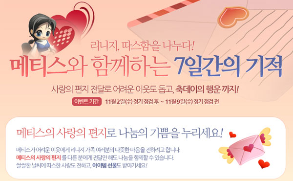 ... 더불어 출석 이벤트에 참여한 게이머들 가운데 가장 많은 출석 참여를 한 게이머들 중 추첨을 통해 30만원 상당의 신세계 상품권, CJ상품권, USB, 오즈캐시 등을 지급한다. 한편, 액토즈소프트에서 서비스하고 있는 장수 온라인게임 캐주얼 액션 RPG '라테일'은 12월