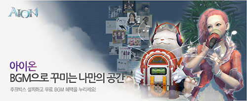 ... 새로운 음악서비스 주크박스는 '아이온'의 3. 0 업데이트 이후 등장한 캐릭터 공간인 주택에 자신이 좋아하는 음악을 배경음악(BGM)으로 꾸밀 수 있는 기능으로, 유저의 주택과 캐릭터의 이미지를 꾸밀 수 있는 또 하나의 수단이다. 주크박스의 재생버튼을 누르면 해당 유저