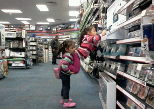...오직 게임을 위해 합체를 시도한 쌍둥이 자매 사진이 화제를 모으고 있다. 미국의 유명 소셜네트워크서비스(SNS)인 페이스북에는 최근 한 마트에서 성인들의 키에 맞춰진 게임기를 사용하기 위해 서커스를 방불케 하는 기묘한 자세를 취하고 있는 어린 소녀들의 사진이 공개됐다.