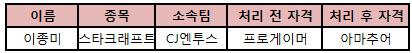 ...한국e스포츠협회(KeSPA)는 자사의 공식홈페이지를 통해 협회 공인종목인 스타크래프트1(스타1)의이종미 선수가 임의 탈퇴했다고 28일 밝혔다. 임의 탈퇴는 프로게임단에 소속된 프로게이머가 선수활동을 하지 않는다는 의사표시를 전한 경우에 한해 진행된다. 앞서 지난 15일 이