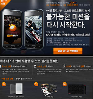 ... 안드로이드 OS 스마트폰 유저 중 베타 테스트 참여를 원하는 지원자는 12월 9일까지 곰TV 사이트에서 참여 신청을 완료해야하며, 선착순으로 모집된 총 3만 명에게는 테스트 일정이 개별 안내된다. 그래텍 플랫폼개발본부 박범서 이사는 "GOM 브랜드에 보내주신 사용자들의