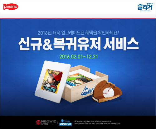 ...복귀 이용자의 경우에도 경기 진행 판수에 따라 선수 재계약 이용권, 랜덤 드래프트권 박스 등의 아이템을 제공하며, 100경기 달성 시 동일하게 W등급 선수를 보상받을 수 있다. 이 밖에도 PC방에서 슬러거를 매일 3경기 이상 진행 할 시 게임머니 30만캣 제공과 1주일 마다 한번씩