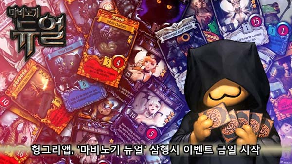... 마. 삼행시 만들면 밥알 지급'으로 '마비노기 듀얼' 카드 중 하나인 '마그마 괴물'과 관련된 삼행시를 작성해 '마비노기 듀얼 헝그리앱' 커뮤니티에 게재하면 추첨을 통해 헝그리앱 내에서 현금처럼 사용할 수 있는 밥알 포인트를 지급한다. 본 이벤트는 9월 12일 오전 11시