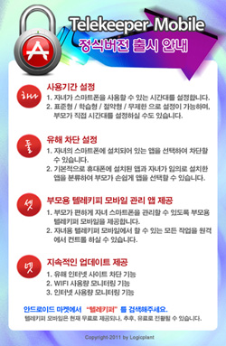 ... 해당 앱은 부모용과 자녀용으로 구분된다. 부모용 앱에서 자녀의 스마트폰을 실시간으로 감시하고 시간 설정, 유해 앱 차단, 월 사용량 제한 기능으로 자녀의 스마트폰 이용을 지도할 수 있다. 자녀가 '텔레키퍼모바일'을 종료하거나 삭제할 수 없도록 삭제 방지 기능이 구현돼 있