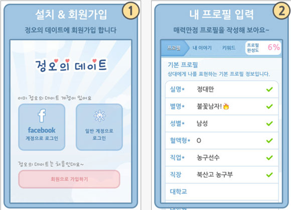 ... ▲ 소개팅 어플 '정오의 데이트' 이용 예시 이중 남녀 싱글들 사이에서 글로벌 SNS서비스인 '페이스북'을 이용한 연인을 찾아주는 일명 '소개팅어플'인 '정오의 데이트'는 올 겨울 솔로탈출을 노리는 이용자들의 높은 호응을 얻고 있다. 이 어플은 자신의 페이스북 계정에 등록