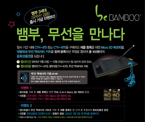 ... 뱀부 태블릿과 무선 액세서리 킷을 함께 구매하고, 제품 등록을 한 구매자에게는 추첨을 통해 총 100명에게 문화상품권 5만원권을 증정한다. 또한, 추가적으로 뱀부 펜&터치(CTH-470)와 뱀부 펀(CTH-670)을 구매한 후 제품 등록을 한 고객 전원에게 각각 4G