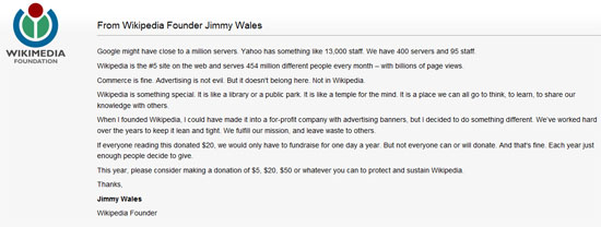 ... 이는 지난달 8월 위키미디어 측이 AP와의 인터뷰에서 운영에 어려움이 있어현재 상태를 유지하기 힘들다고 토로한 것에 이어 4개월 만에 공식적으로 네티즌들에게 경영난을 호소한 것. 그가 밝힌 호소문에 따르면 그동안 위키백과는 광고 없이 진행돼 왔으며 영리 목적보다는 지식을