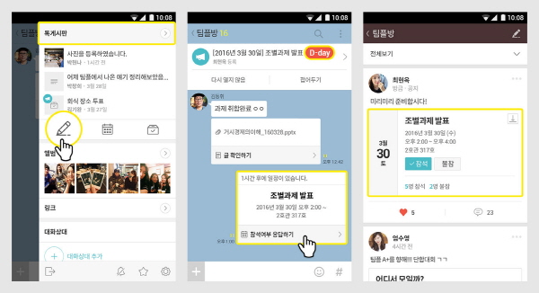 ...오가는 대화 중 놓치기 쉬운 중요한 내용은 상세히 기록하여 공지로 등록하고, 오랫동안 간직하고 싶은 내용을 보관할 수도 있다. 모두가 기억해야 하는 이벤트는 일정에 공유해 관리하고, 멤버간 투표를 통해 의견 수렴하기도 수월해진다. 톡게시판은 카카오톡 채팅창 우측 상단에 세 줄로 표