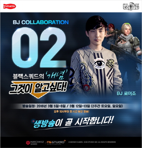 ... 방송에서는 '블랙스쿼드'의 콘텐츠를 소개하고, 이용자에게 유용한 정보를 제공해 나갈 계획이다. 특히 총기류 분석, 스킬 사용 노하우 등 그 동안 이용자들이 궁금해 했던 것들이 중점적으로 다뤄진다. 인기 BJ 로이조와 함께하는 '블랙스쿼드' 방송은 아프리카TV를 통해