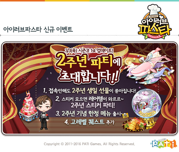 ... 파티게임즈는 '아이러브파스타 for Kakao'의 2주년을 맞이해 이벤트를 진행하고 3월 한 달간, 총 3번에 걸친 대대적인 '시즌 3' 업데이트를 진행한다. 먼저, '시즌 3'의 첫 업데이트이자 '아이러브파스타 for Kakao'의 '2주년 파티'가 진행된다.