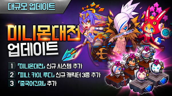 ...이번 업데이트에서는 신규 영웅 요정 '피나', 거너 '카이'와 상인으로 등장했던 '루디'가 새로운 미니몬으로 추가됐으며, 중국 서비스 이용자들을 위해 중국어 '간체' 서비스가 추가됐다. 파티게임즈는 이번 '미니몬대전' 업데이트를 기념해 오는 9일까지 3가지의 이벤트를 진행한다. 먼
