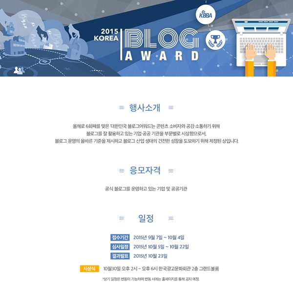 ... 참여를 원하는 업체는 10월 4일까지 한국블로그산업협회 홈페이지를 통해 신청 접수할 수 있다. 응모 자격은 현재 공식 블로그를 운영 중인 공공기관 또는 기업에 한한다. 수상작은 10월 5일부터 22일까지 1,2차 심사를 거쳐 10월 23일에 최종 발표될 예정이다