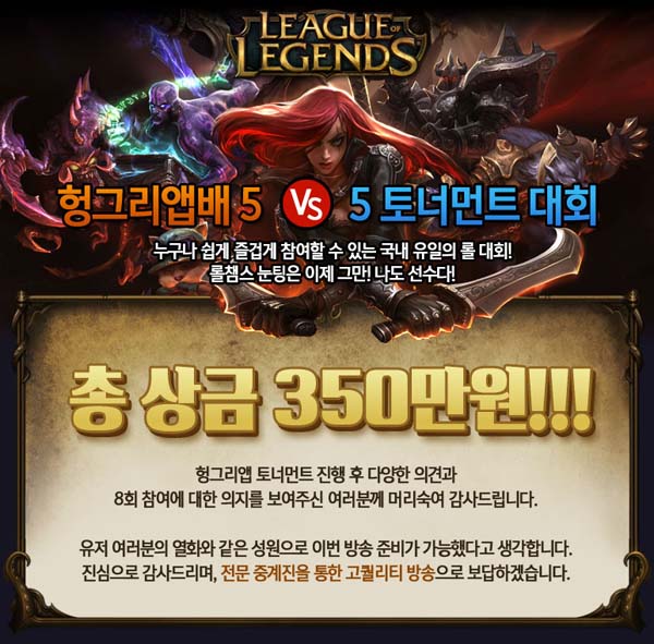 ... 이번 대회는 남녀노소, 티어에 상관없이 누구나 자유롭게 참가할 수 있다. 참가 팀에게는 총 350만 원의 상금이 순위에 따라 차등 지급된다. 또한, 모든 참가 팀에게는 팀 당 650 RP(게임 캐시)가 제공된다(단, 1~3위 팀 제외)