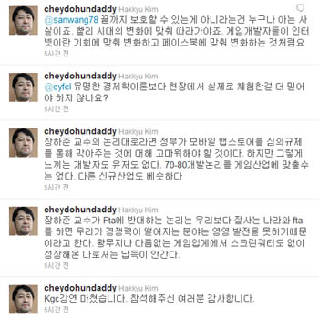 ... 그는 "장 교수가 FTA에 반대하는 논리는 잘사는 나라와 FTA를 하면 경쟁력 떨어지는 분야에서 영영 발전할 수 없다는 것이 이유"라며, "황무지나 다름없이 아무런 정부보호장치 없는 게임업계에서 성장해온 나로서는 납득이 안가는 논리"라 밝혔다. 국제적인 경쟁력이 떨어지는