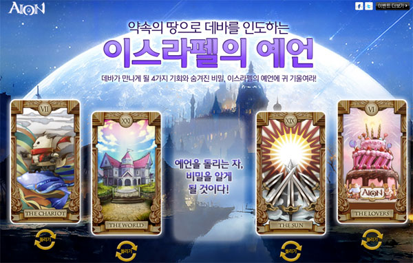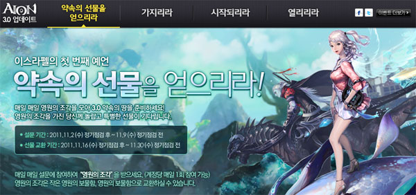 ... 해당 페이지의 예언에 따르면 2011년 11월 16일에 새로운 약속의 땅인 신규서버 레파르가 오픈고, 이와 함께 7일에는 아이온 3. 0의 스페셜 페이지가 16일에는 신규 서버의 오픈 공지가 공개될 예정이다. 이로써 아이온은 총 44개의 서버로 게임을 서비스하게 되며, MM