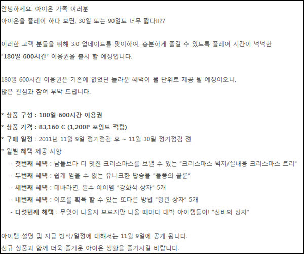 ... 기존 이용권은 표준 이용권(30일 300시간, 19800원)과 파워 이용권(90일 900시간, 47520원)의 2가지가 있었지만 이번 180일 600시간 이용권의 추가로 선택의 폭이 넓어졌다. 이번 이용권을 구입하면 크리스마스 벽지와 실내용 크리스마스 트리, 유니크한 탑승물