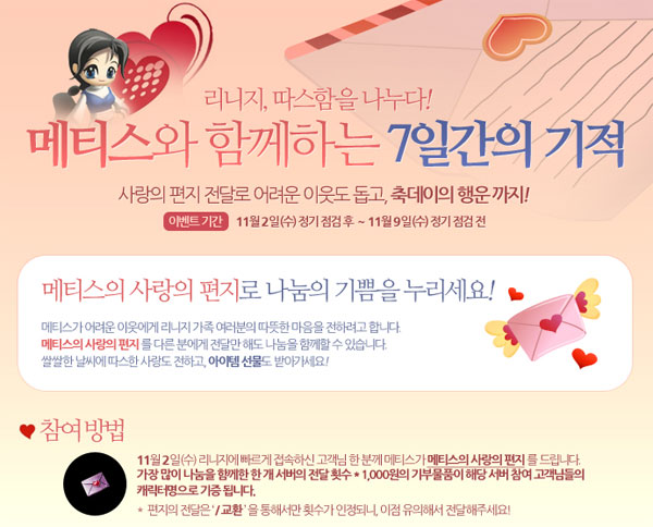 ... 가장 많이 편지를 전달한 1개 서버의 전달 횟수 * 1천원의 기부물품이 편지 전달에 참여한 유저들의 캐릭터 명으로 기증된다. 이와 함께 100번째 단위로 참가하거나 게시판을 통해 이번 이벤트를 응원한 유저에게는 게임 내 아이템인 축복받은 무기 마법 주문서도 선물로 지급된다.
