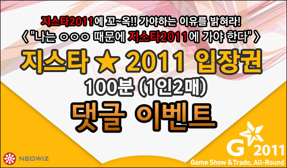 ... * 참여방법 : '지스타2011'에 참석해야 하는 이유를 댓글을 통해 적어주세요* 이벤트 경품: '지스타2011' 입장권 100장 (1인2매)* 이벤트 기간: 11월 2일~11월 8일 * 당첨자 발표: 11월 9일 / 당첨여부 이메일 발송 [게임조선 편집국 gamedes