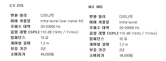... ▲ CX215(좌), MX365(우) 먼저, 젠하이저 CX215는 블루와 그린, 오렌지, 레드, 브론즈 등 5가지 원색의 제품으로 외부 소음 차단 효과와 사운드 손실이 적고 강력한 베이스 사운드를 자랑해 MP3 및 휴대용 게임 등 장시간 야외활동에 최적화된 제품으로 3가지