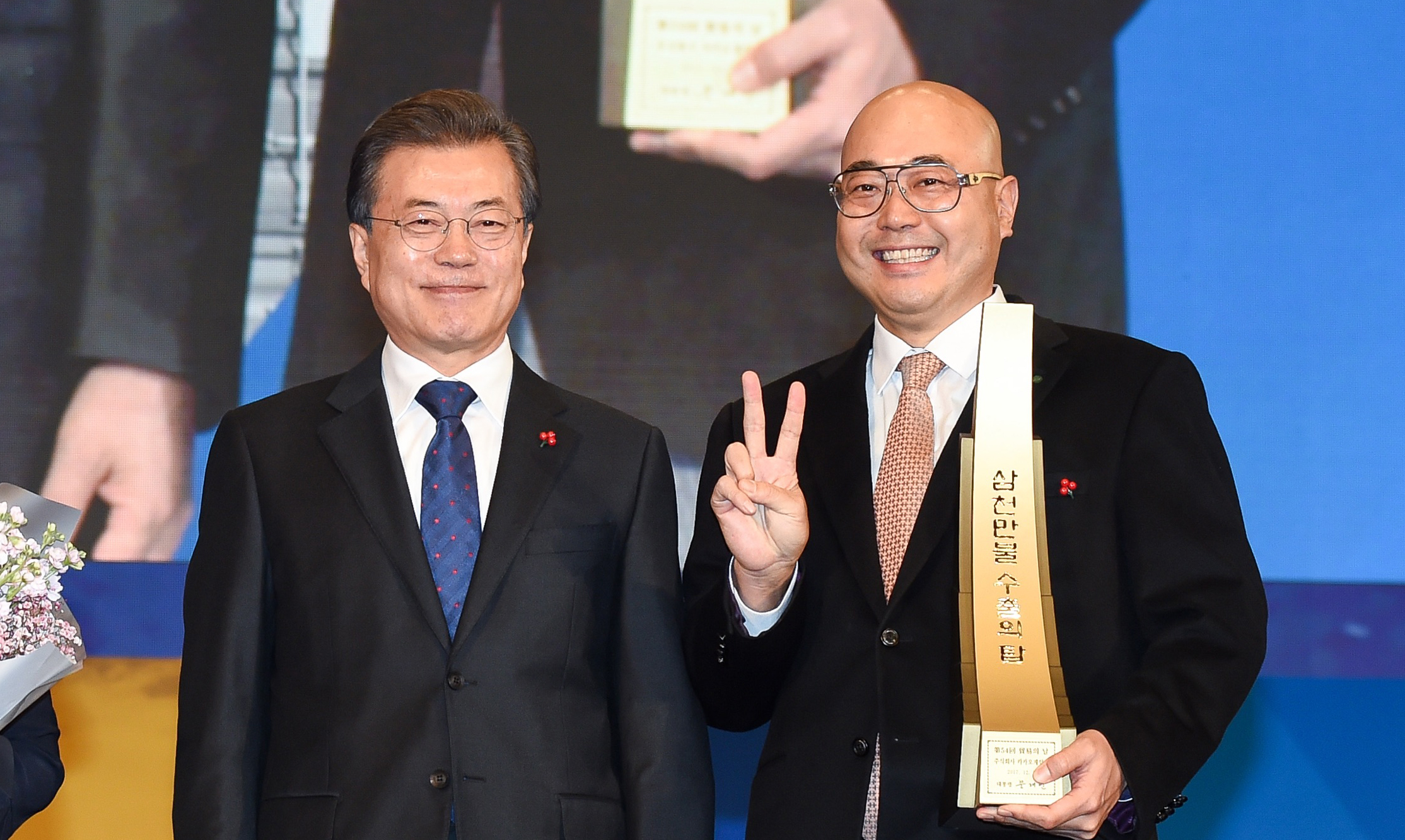 ...▲ 펄어비스 김대일 의장이 대통령표창을 받고 있다. (사진=펄어비스 제공)5일 오후 ‘2017 대한민국 콘텐츠 대상’ 시상식이 열린 가운데 김대일 펄어비스 의장이 해외진출유공(수출유공)부문 대통령표창을 수상했다. 게임업계 인물이 이 시상식에서 대통령표창을 수상한 것은 2012년