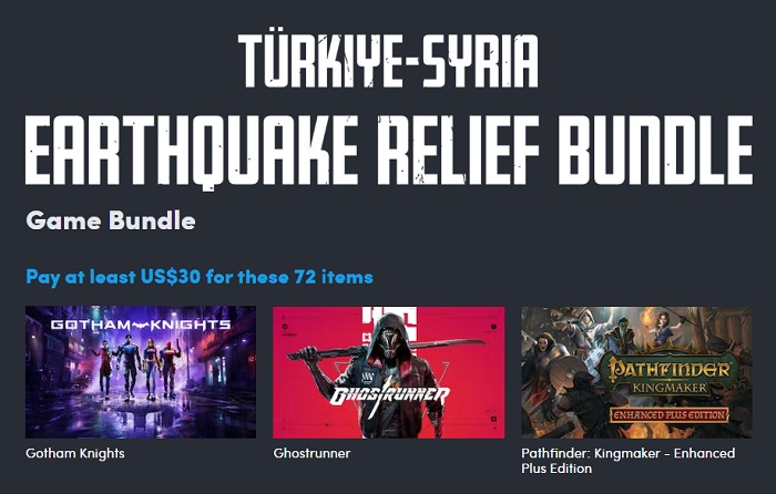 ... 번들에는 고담 나이트와고스트러너, 엑스컴 2, 페이데이2 등 다양한 인기작이 포함돼 있다. 번들 판매 페이지에서는 현재 번들 판매액과 최고 기여자 99인을확인할 수 있다. 한편, 이번 번들 판매전액은 다이렉트 릴리프, 국제의료봉사단, 세이브더칠드런에 전달된다