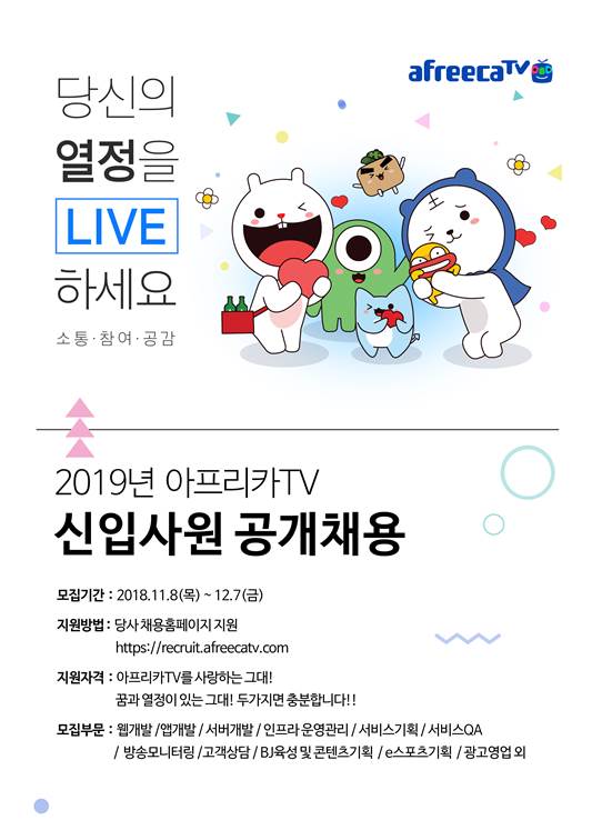 ...이번 공개 채용에서는 운영, CS, 콘텐츠 기획, 개발, 플랫폼 기획, 영업 등 6개 직군 16개 부문의 인재를 모집한다. 모집부문으로는 ▲야간 콘텐츠 운영 ▲방송 모니터링 ▲방송 시스템 기술 기획 ▲고객상담 및 지원 ▲BJ육성 및 콘텐츠 기획 ▲e스포츠 기획 및 운영 ▲게임 B