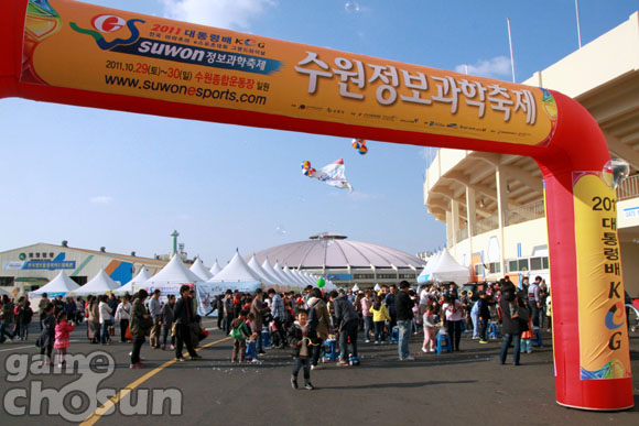 ... ▲ 비누방울 만들기 행사가 한창인운동장 입구 ▲ 수원 지역 학교들이 대거 참가한 학생과학축제 ▲ 학생이 만든 로봇을 심사 중인 모습 ▲ 둘리 인형과 기념사진을 찍는 아이들 ▲ 레이저 부스의 모습 ㅋ ▲ 모바일 게임업체 컴투스도 참여했다 ▲ 가장