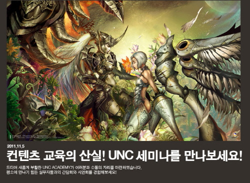 ... 10년 이상의 게임 개발 경력을 지닌 UNC아카데미 신준우 원장과 엔씨소프트 '리니지2' 캐릭터 디자이너로 유명한 정준호 사외이사, UNC아카데미 강사진들이 직접 게임개발, 애니메이션VFX, 웹 마스터 과정의 프로세스 시연에 나선다. 오는 11월 5일 오후 1시부터 4시까