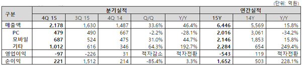 ... 2015년 연간 매출은 전년대비 15. 8% 증가한 6446억원이며, 영업손실 543억원, 당기순이익은 1652억원으로 집계됐다. 4분기 매출을 부문별로 살펴보면, PC온라인 게임은 웹보드 게임이 계절적 영향으로 소폭 상승했지만, '엘소드'와 '에오스' 등 주요 온라