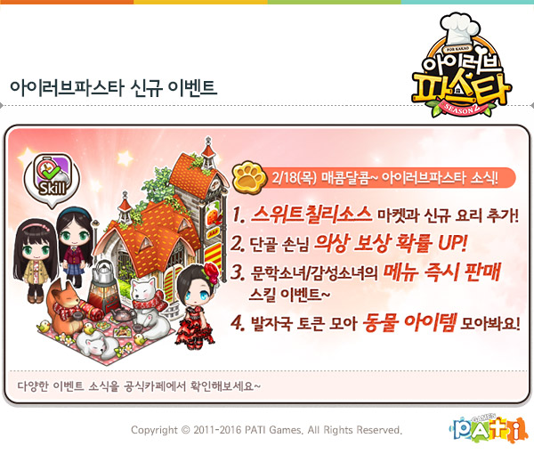 ...더불어 긴 생머리가 아름다운 단골손님 문학소녀와 감성소녀에게 18일부터 다음달 3일까지 '메뉴 판매 즉시 완료' 스킬이 부여되며, 같은 기간 모든 단골손님의 호감도 보상 내 의상 획득 확률이 대폭 상승된다. 18일부터 3월 2일에는 '발자국 토큰'을 모아 '여우들의 티타임', '푹