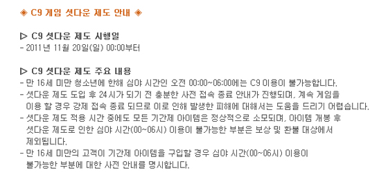 ... 웹젠에 따르면, 셧다운 제도 시행 이후 만 16세 미만 이용자들은오전 0시부터 6시까지 'C9'에 접속할 수 없다. 만약 제한 시간을 초과할 경우강제로 서비스가 종료된다. 단, 셧다운 제도는 만 16세 미만의 청소년에게만 해당되는 사항으로 만 16세 이상 회원들은 기존과