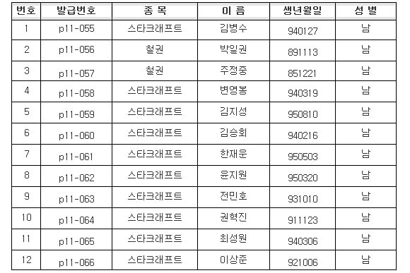 ...한국e스포츠협회(이하 협회)가 지난9월 6일에 실시한'2011 하반기 프로게이머 소양교육' 이수자를 공지하며 새로이 프로게이머로 인정받은 선수들의 명단을 10일 홈페이지를 통해 공개했다. 프로게이머 자격은 소양교육에 필히 참여한 후에 얻을 수 있으며 12명의 신규 선수들은 이