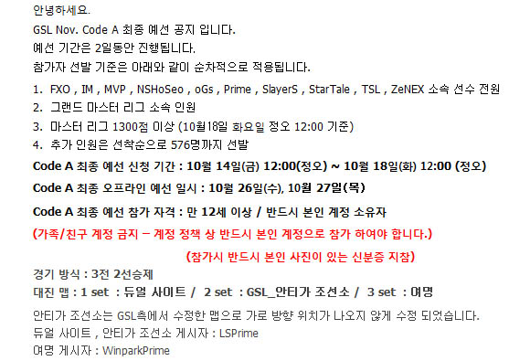 ... 해당 내용에 따르면 GSL 2011 시즌7 예선은FXO와 IM, MVP, NS호서, oGs,프라임,슬레이어스, 스타테일, TSL,제넥스소속 선수 전원이우선 참여 자격을 얻으며 10월 18일 정오 기준 마스터 리그 1300점 이상 유저가 차순위로참가가능하다. 또한선착순 57