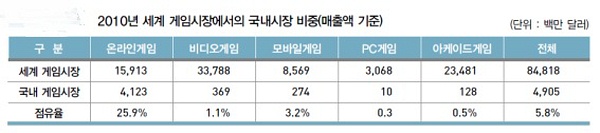 ... 백서에 따르면 지난해 매출액 기준, 국내 게임시장(49억 500만 달러)은 세계 게임시장(848억1,800만 달러)에서 5. 8%의 점유율을 기록했다. 이는 예년에 비해 무려 2
