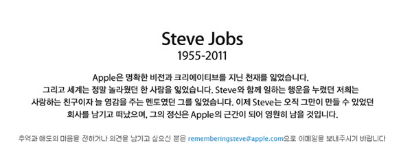 ... 특히 애플은 "잡스의 명석함과 열정, 에너지는 우리의 삶을 풍요롭게 한 무한한 혁신의 원동력이었다"며 "세상은 잡스 덕분에 헤아릴 수 없을 만큼 좋아졌다"고 전했다. 이어 "그가 우리에게 남긴 놀라운 유산에 감사를 보낸다"고 애도의 뜻을 표했다. 한편, 잡스는 수년