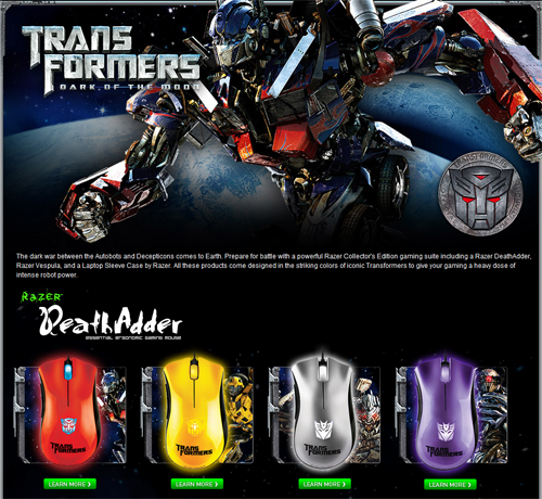 ... 트랜스포머3 에디션은 레이저 베스퓰라 양면 마우스 패드를 포함하고 있다. 베스퓰라의 스피드면은 속도 향상 기능을 제공, 오토봇을 상징하고, 컨트롤면은 디셉티콘 컨셉으로 정밀한 마우스 컨트롤 기능이 강화했다는 점이 특징. 이번 에디션에는 레이저가 특별히 디자인한 트랜스포머