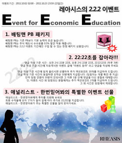 ...2 이벤트 실시"국내 소셜네트워크서비스(SNS) 개발사 레아(대표 오혜정)는 자본 흐름의 이해와 활용을 통한 교육적인 효과와 SNS을 가미한 레아시스 (rheasis. com)에서 2일부터 22일간 '2. 2