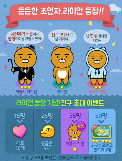 ... 1성 라이언의 경우 누구나 친구 초대를 통해 손쉽게 획득이 가능하지만, 2성 후드 라이언과 3성 마술사 라이언은 새롭게 도입된 합성 시스템을 통해 만나볼 수 있다. '프렌즈팝'은 '라이언' 등장을 기념해 친구 초대 이벤트를 실시한다. 게임 내 친구 초대 기능을 통해 본인