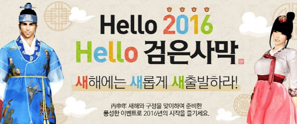...年!' '한복입고 복 받아가세요' 등의 이벤트로 꾸며질 예정이다. 먼저 '신규 모험가를 위한 7일의 행복' 이벤트는 검은사막에 첫 발을 내딛은 신규 모험가에게 '텀벙텀벙 낚시복 세트(7일)' '5세대 암말(무제한)' '밸류패키지(7일)' '아제리안 방어구 세트' 등이 포함된 '신규