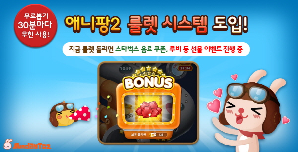 ...'애니팡2'의 서비스를 담당하고 있는 최형일 PD는 "룰렛 메뉴를 통해 다양한 아이템을 이용하는 퍼즐 맞추기의 전략적 재미가 더해질 것으로 기대한다"며 "보다 재미있고 쉽게 게임을 즐길 수 있도록 다양한 선물들을 준비할 예정"이라고 말했다. 한편, 선데이토즈는 '애니팡2' 룰렛