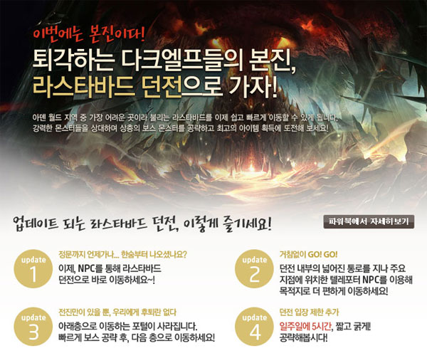 ... 특히 라스타바드 던전은 고급 아이템인 진명황의 집행검의 주요 재료 아이템의 제작 장소로 기존 소수의 유저들의 전유물이었던 이 던전이 일반 유저들도 쉽게 이용이 가능하게 됐다. 또, 오리하루콘 단검이 드롭되는 지역인 정령의 무덤은 정령의 오브라는 순간이동 오브젝트가 다수 추가