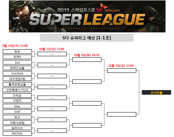 ... 넷마블이'스페셜포스2'대회 '슈퍼리그 온라인' 예선 규정과 대진표를 공개했다. 지난 24일부터 시작된 이번 예선은 총 2560개 클랜이 40개 조로 나뉘어 참가하며, 10월 9일 21시 게임을 마지막으로 종료된다. 이번 예선은 2개 조 마다같은 시간대에 진행되며,1-1