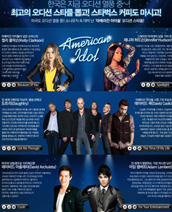 ...허각, 백청강, 존박 등 한국의 오디션 스타처럼 미국에서 오디션으로 스타덤에 오른 인물들의 실력은 어떨까? 음악전문사이트 몽키3는 아메리칸 아이돌 출신 소니뮤직 스타 6인의 히트곡을 모은 스페셜 패키지를 공개했다. 이번 패키지는 ▲ 아메리칸 아이돌이 낳은 슈퍼스타 켈리 클락슨