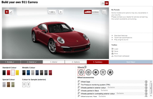 ... 해당 꾸밈툴을 이용하면 포르쉐 911의 색상, 휠 종류, 휠 액세서리, 인테리어 등 옵션을 조정해 꾸며볼 수 있다. 3D 모드를 선택하면 자체를 회전시키거나 확대할 수 있고, 차량 내부와 야간 모드도 선택 가능하다. 야간 모드 배경은 독일 슈트트가르트의 포르쉐 뮤지엄에서