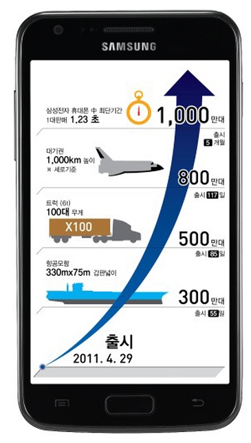 ... 이는 삼성전자 휴대폰 가운데 가장 짧은 시간 내에 세운 기록으로, 하루에 6만대 이상, 1초에 1대 꼴로 팔려나간 셈이다. 전작인 갤럭시S보다 500만대 돌파 시점을 40일이나 앞당겼고, 1000만대 기록 역시 2개월 앞섰다. 갤럭시S2는 국내 360만대, 유럽 34
