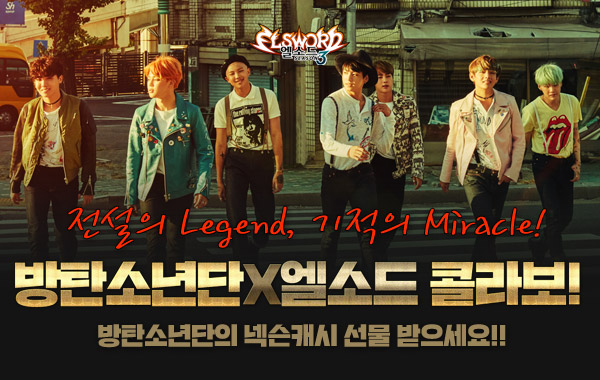 ...넥슨은 이번 제휴를 기념해 게임 내에서 '엘소드'와 '방탄소년단' 캐릭터들의 닮은 점을 찾아 이벤트 게시판에 댓글로 남긴 유저에게 추첨을 통해 '넥슨캐시'를 선물한다. '방탄소년단'은 2013년에 데뷔한 인기 그룹으로, 최신 타이틀곡 '런(RUN)'이 지난해 미국 빌보드가 선정한
