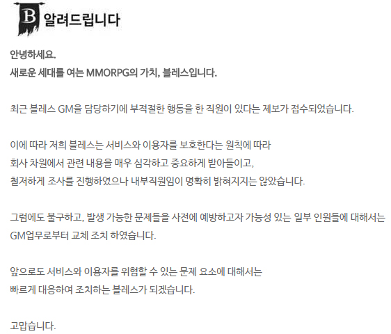 ... 이어 네오위즈게임즈 측은 "발생 가능한 문제들을 사전에 예방하고 가능성 있는 일부 인원들에 대해서는 GM업무로부터 교체 조치했다"고 덧붙였다. 네오위즈게임즈 한 관계자에 따르면 현재 관련팀에 대해 조사를 진행했지만 실제 해당 게시글을 올린 인물이 실제 회사 직원인