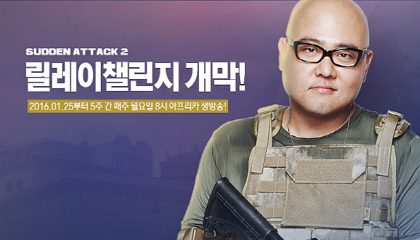 ...넥슨은 추후 별도의 이벤트를 마련해 도전자들이 제공한 경품을 유저들에게 선물할 계획이다. 방송은 25일부터 2월 29일까지 매주 월요일 오후 8시 총 5화 아프리카TV를 통해 생중계되며, 온상민 캐스터, 챔스걸 이지인 리포터가 진행을 맡는다. 서든어택2는 106주 연속 PC방 점유