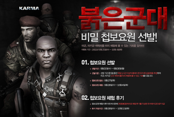 ... 드래곤플라이(대표 박철우)의 3인칭 슈팅(TPS)게임 ‘카르마’가 신규 캐릭터 체험 및 후기 이벤트를 실시한다고 22일 밝혔다. 회사 측에 따르면, ‘붉은 군대 비밀첩보요원 선발’이라 명명된 이번 이벤트는 21일부터 26일까지 6일간 매일 1시간 이상 플레이한 게이머 중 1