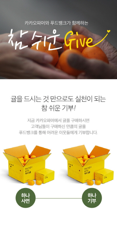 ...카카오파머 제주는 푸드뱅크 지원을 위해 지난해 12월 제주특별자치도 사회복지협의회에서 운영하는 제주광역 푸드뱅크와 기부협약을 맺고 카카오 선물하기에서 기부 캠페인을 진행하고 있다. 카카오파머 제주는 참쉬운 기부 캠페인을 통해 지난 연말까지 이어진 궂은 날씨로 수확 시기를 놓치고 가